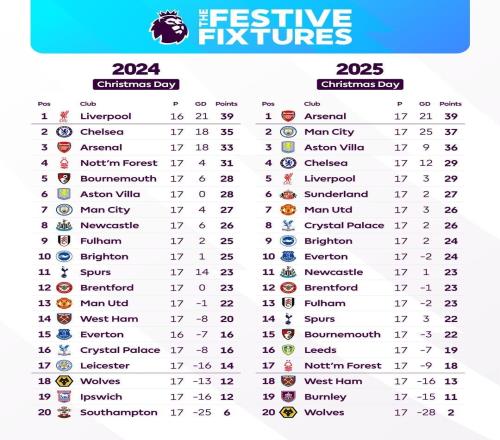 北京時(shí)間12月25日,德轉(zhuǎn)列出了2024年和2025年圣誕節(jié)當(dāng)天的英超積分榜,巧合的是,利物浦和阿森納以相同的積分以及...