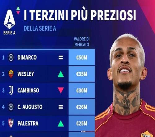 德轉(zhuǎn)列意甲邊后衛(wèi)身價(jià)前10:國(guó)米4人上榜,迪馬爾科5000萬(wàn)第1