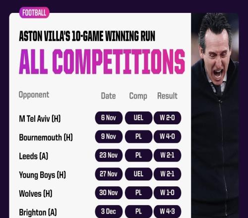 如果客勝切爾西,維拉將追平隊史最長11連勝
