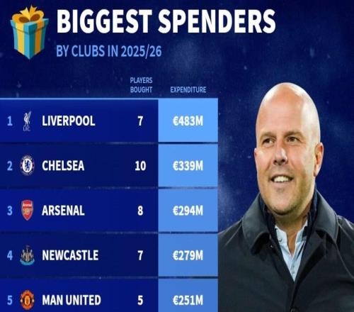 德轉(zhuǎn)列本賽季俱樂部引援支出前10:英超9席,利物浦4.83億第1