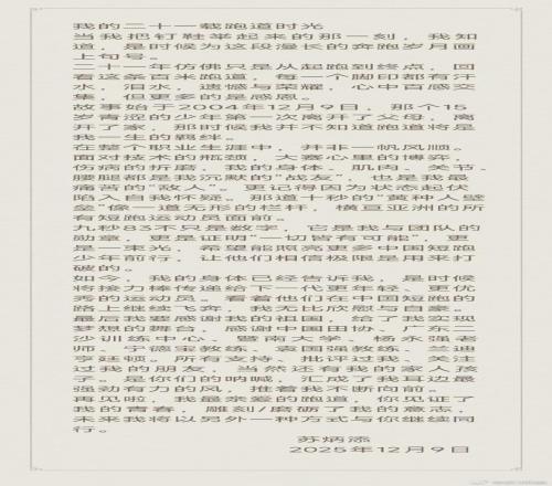 剛剛(12月9日),男子100米亞洲紀(jì)錄保持者、中國短跑名將蘇炳添發(fā)布微博宣布退役。
