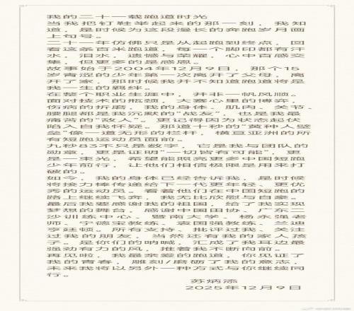 12月9日,蘇炳添在個人賬號上發(fā)布長文《我的二十一載跑道時光》:
