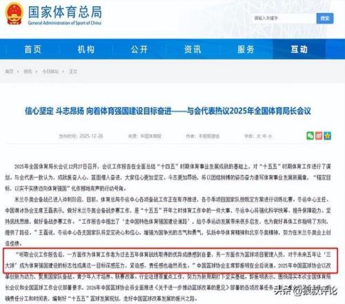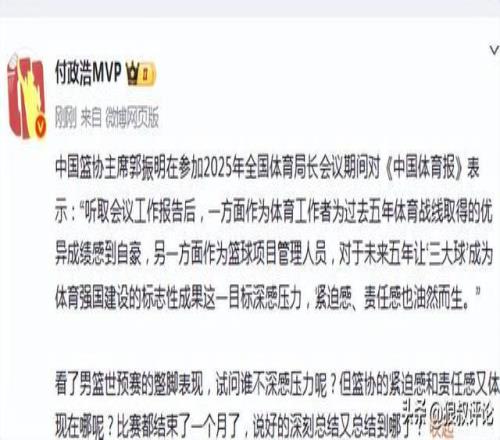 北京時間12月29日,中國籃協主席郭振明在參加2025年全國體育局長會議期間對《中國體育報》表示:“聽取會議工作報告后,一方面作為體育工作者為過去五年體育戰(zhàn)線取得的優(yōu)異成績感到自豪,另一方面作為籃球項目管理人員,對于未來五年讓‘三大球’成為體育強國建設的標志性成果這一目標深感壓力,緊迫感、責任感也油然而生。”