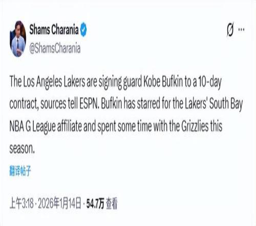 北京時間1月14日,據(jù)名記Shams報道,湖人已同意與后衛(wèi)科比-巴夫金簽下一份10天短合同。巴夫金是2023年NBA選秀的首輪15號秀,職業(yè)生涯前兩個賽季效力于老鷹,休賽期被交易至籃網(wǎng),隨后在2025-26賽季常規(guī)賽開打前被籃網(wǎng)方面裁掉。
