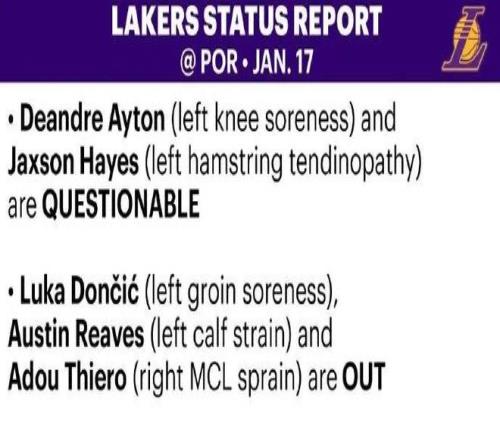 根據(jù)湖人官方公布的傷病報告,東契奇(左側(cè)腹股溝酸痛)、里夫斯(左小腿拉傷)和蒂耶羅(右膝內(nèi)側(cè)副韌帶扭傷)休戰(zhàn),艾頓(左膝酸痛)與海斯(左腿筋肌腱炎)出戰(zhàn)成疑。
